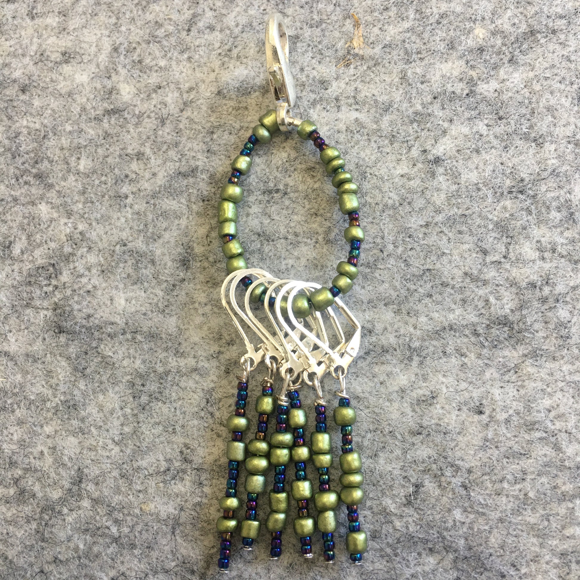 Set of six hand beaded, removable stitch markers (perfect for crochet or knitting and also happen to be earrings!) Each set comes with a matching keeper clip to keep your stitch markers available and accessorizing whatever zipper you clip it to. Stitch Markers are used by many knitters and crocheters to help keep track of their progress in a pattern, note an increase or decrease on a project, help with those pesky long chains and cast ons or signify a "special stitch" like a cable, lace, or other design element. They also are just another fun notion to use in your projects and can coordinate with your yarn if you're really into it!