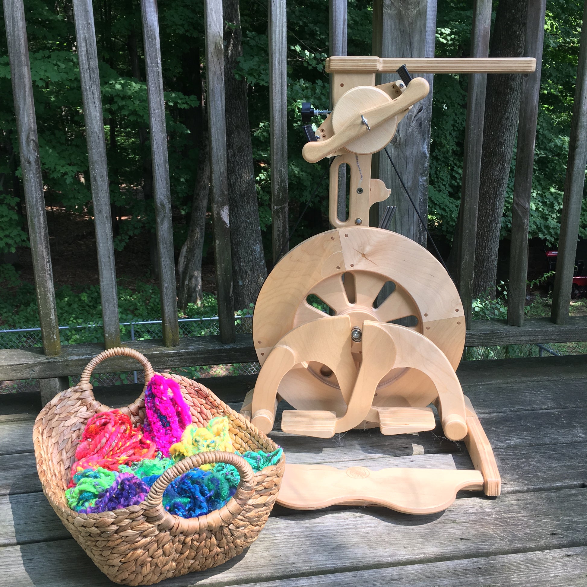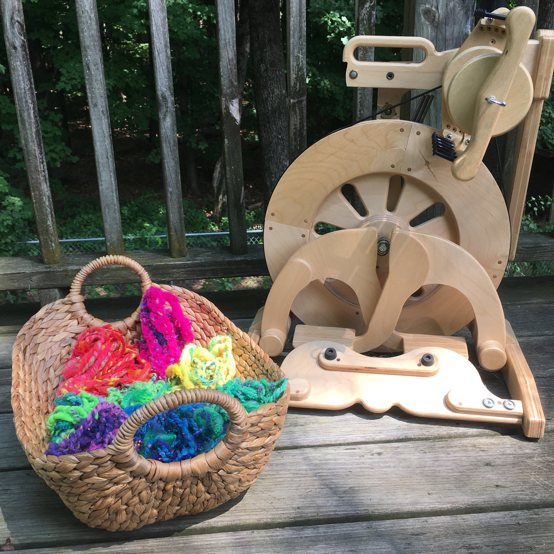 BULLFROG: It folds up in seconds for easy carrying and includes three 16 oz bobs (can use 8oz as well, shown here). The carrying handle makes it easy to bring with you to fairs and festivals. The heel pad folds up for a small footprint when not in use. Fine to worsted to bulky and art yarns. Drop Shipped New to You from the Manufacturer. Please contact me immediately with photos of any issues that may arise with a purchased wheel. Small imperfections in bobbins are possible and do not affect use.